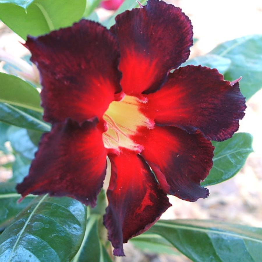 Adenium Double Color - красивый кустарник с мясистым стволом. Листья огромные, глянцевые, темно-зеленые с салатовой полосой. Цветки немахровые, крупные с желтым основанием. Лепестки красные с темно-бордовыми краями.