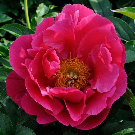 Саженцы пиона Eventide – находка для дизайнерского ландшафта. Крупный цветок чашевидной формы с малиново-красными вкраплениями в сердцевине и рельефной текстурой, пестики зеленоватого оттенка с розовыми рыльцами, пыльники желтоватые. Кустарник высокий с волнистой темно-зеленой листвой отличается ранним сроком цветения.