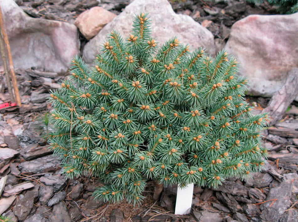 Ель шаровидной формы. Крона плотная компактная, к 10-ти годам диаметр кроны около 30 см. Годовой прирост 2-3 см. В штамбовой форме высота зависит от места прививки. Хвоя серебристо-голубая. Место солнечное. Почва умеренно влажная, дренированная. Зона 3 (до -34ºС). Отличный сорт для небольших приусадебных участков, альпинариев, для выращивания в контейнерах.